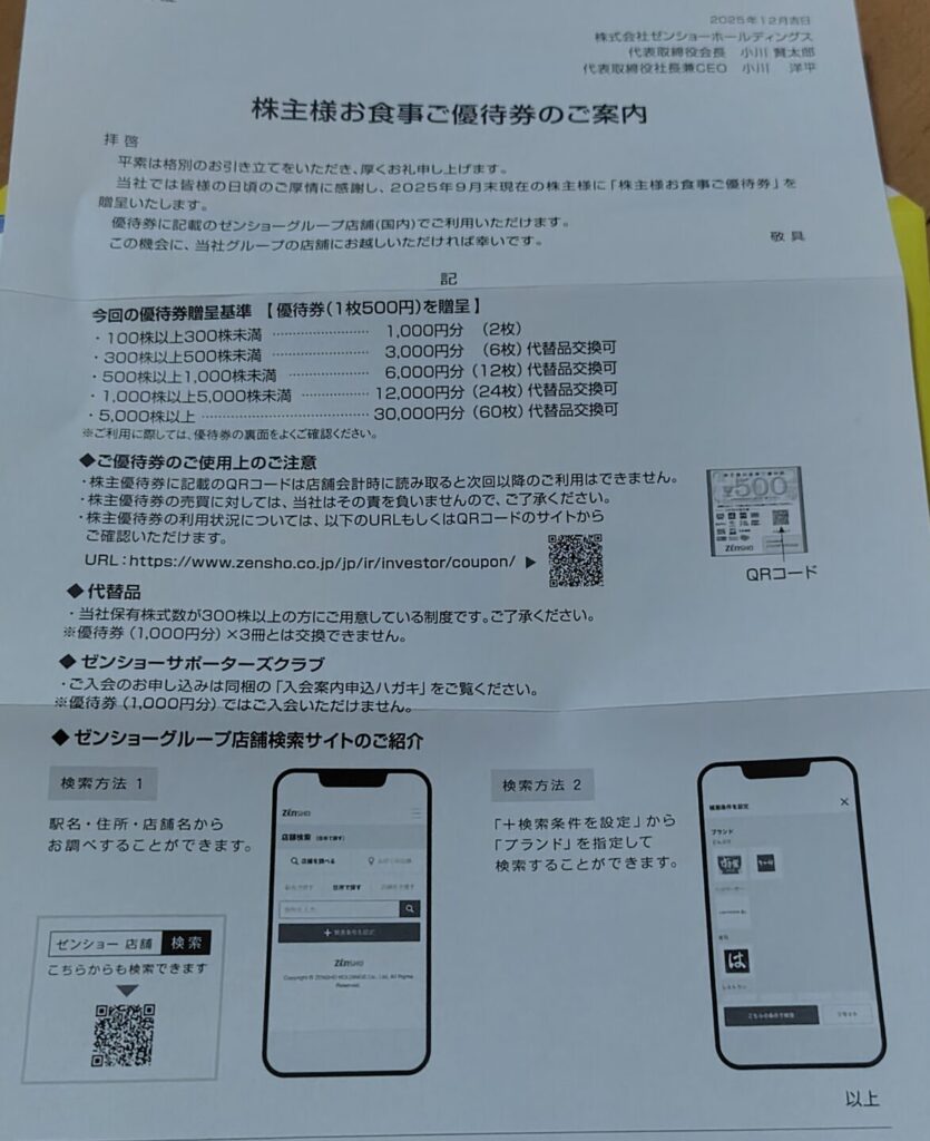 今回は、Zenshoから株主優待券が届いたので、その内容と使いみち、会社のこと、株価の目安などをまとめて紹介するよ〜😊
