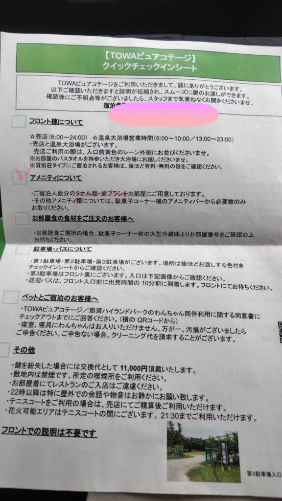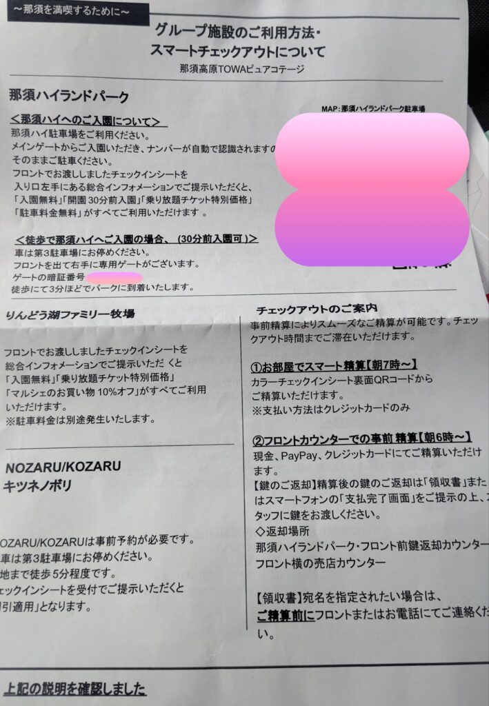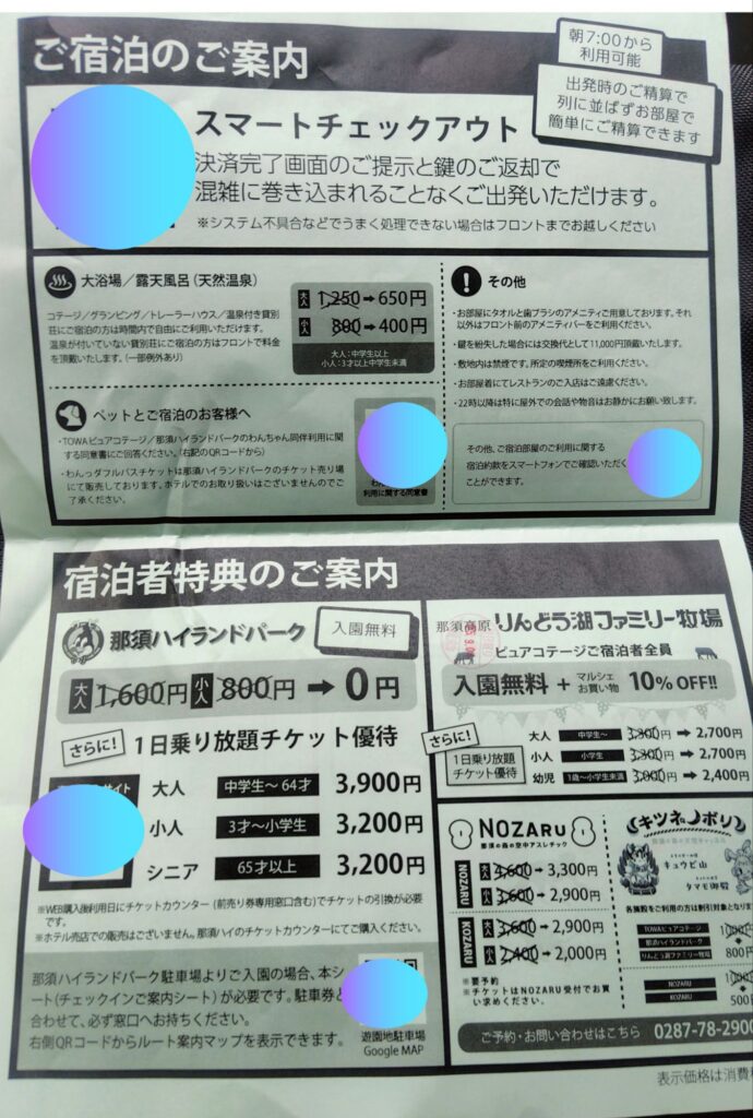 チェックインの際にいただいた案内もわかりやすく、那須ハイランドパークやりんどう湖ファミリー牧場の割引・無料特典もセットになっていて、株主優待ならではのお得感を実感できます。